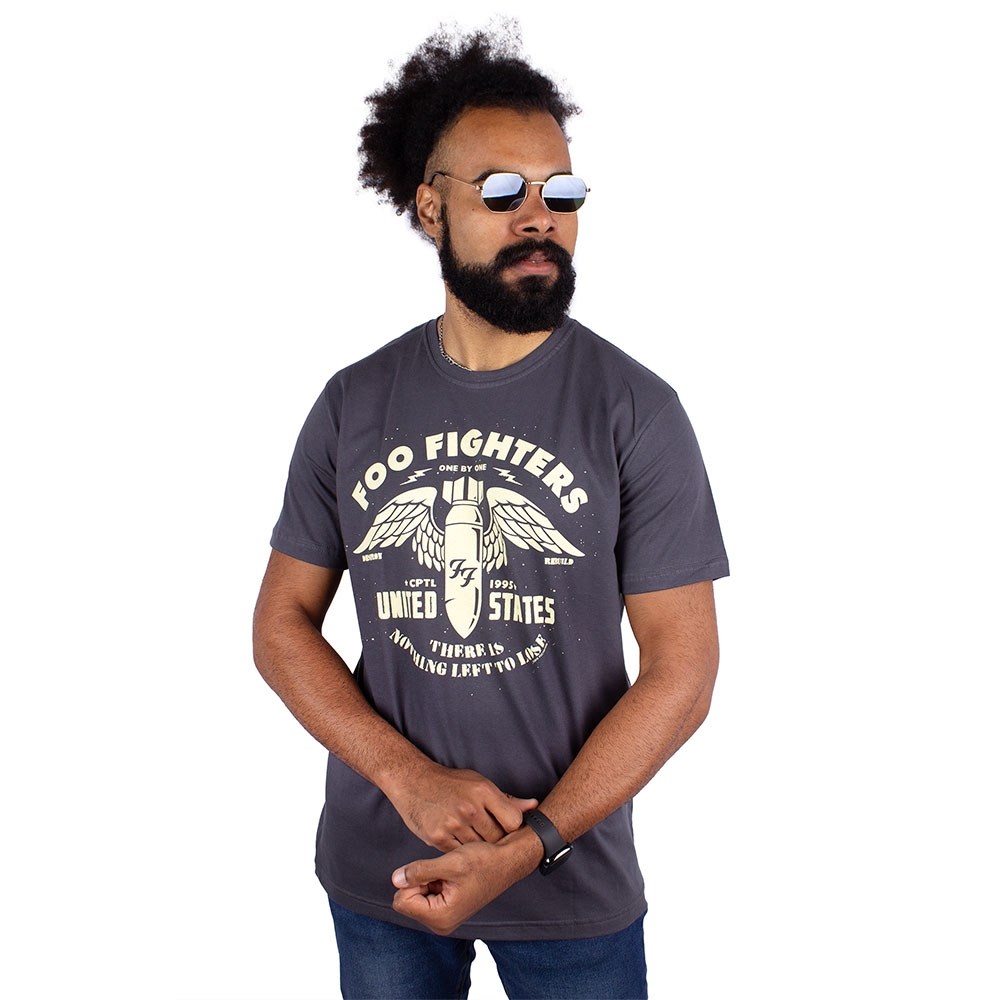 A Camiseta Foo Fighters One By One Chumbo - Oficial é uma celebração do poder e da persistência do rock. A estampa traz um design marcante com uma bomba alada e o icônico logo “FF”, cercado por frases emblemáticas como “There is nothing left to lose” e “One by One”, remetendo aos lendários álbuns da banda.