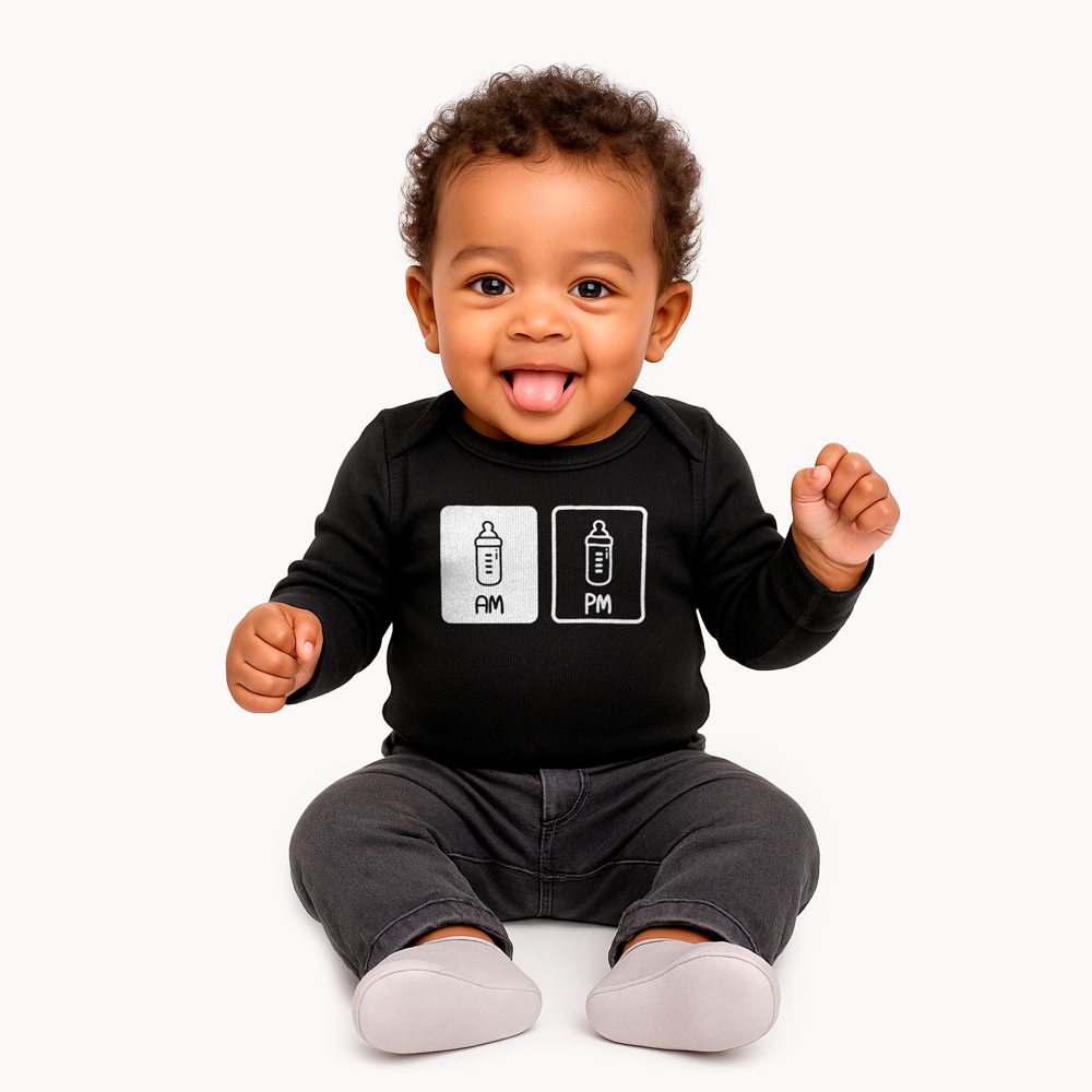 De dia, a mamãe encara a rotina com muito café (AM), à noite relaxa com uma cervejinha (PM)… enquanto o baby só quer saber de mamadeira o dia inteiro! 🍼😄