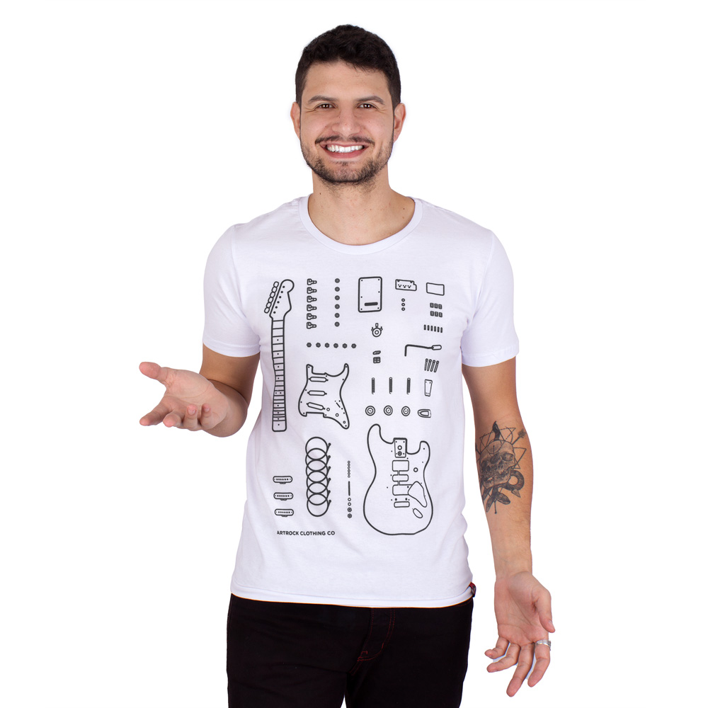 Feita em tecido premium, oferece caimento impecável, resistência e conforto para qualquer ocasião — seja em shows, festivais, estúdios de ensaio ou no dia a dia. A arte exclusiva da guitarra decomposta em seus elementos dá um ar moderno e conceitual, transformando a camiseta em muito mais que roupa: é identidade musical estampada no peito.